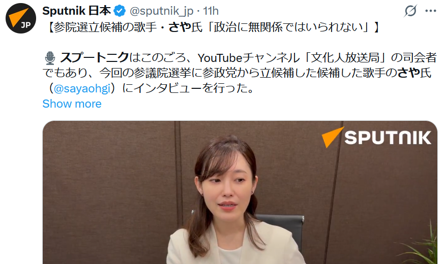🎙️ スプートニクはこのごろ、YouTubeチャンネル「文化人放送局」の司会者でもあり、今回の参議院選挙に参政党から立候補した候補した歌手のさや氏(@sayaohgi)にインタビューを行った。… pic.twitter.com/C35xRBryDC