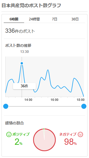 Yahooのリアルタイム分析で共産党に対し、ネガティブ評価が圧倒的!!