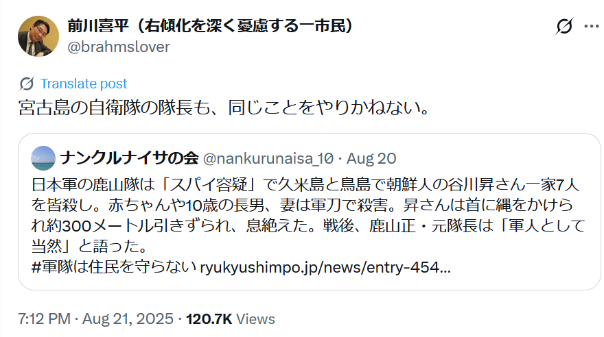 前川さんは「宮古島の自衛隊の隊長が訓練への抗議における拡声器中止を求めたから、いずれ島の一家を皆殺しにするかもしれない」とお考えなのか???