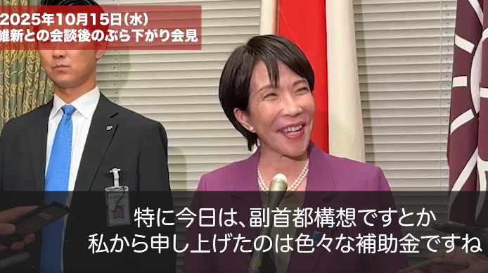 高市総裁は、10月15日、維新との政策協議後の記者会見で、「それから私から申し上げたのは色々な補助金ですね、こういったものを整理していきたい。こういった話を申し上げました。」と発言した!