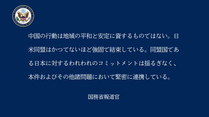 アメリカ国務省が「中国の行動は、地域の平和と安定に資するものではない」と批判