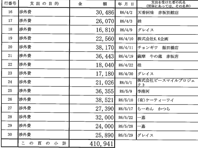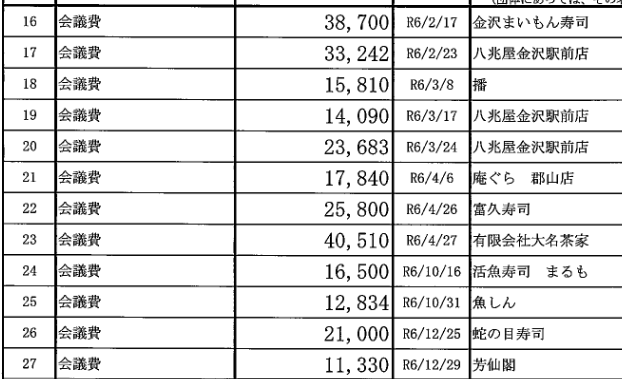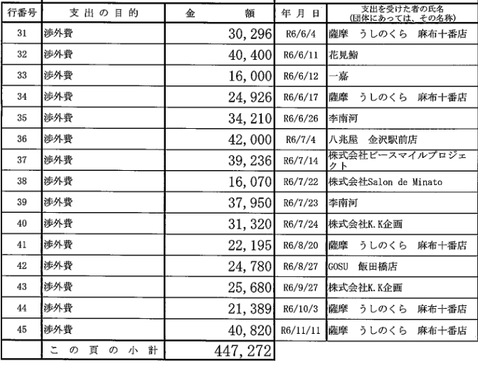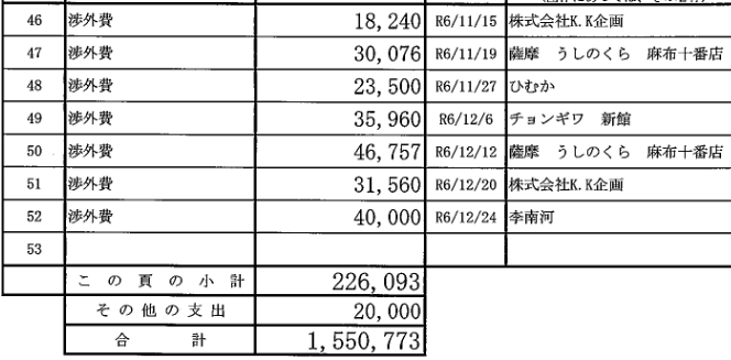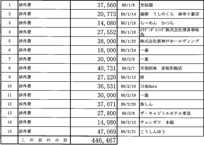 そして、今度は渉外費名目での多額の飲食店への支出が明らかになる。なんと52件で、いずれも万単位の支出なのだ!!